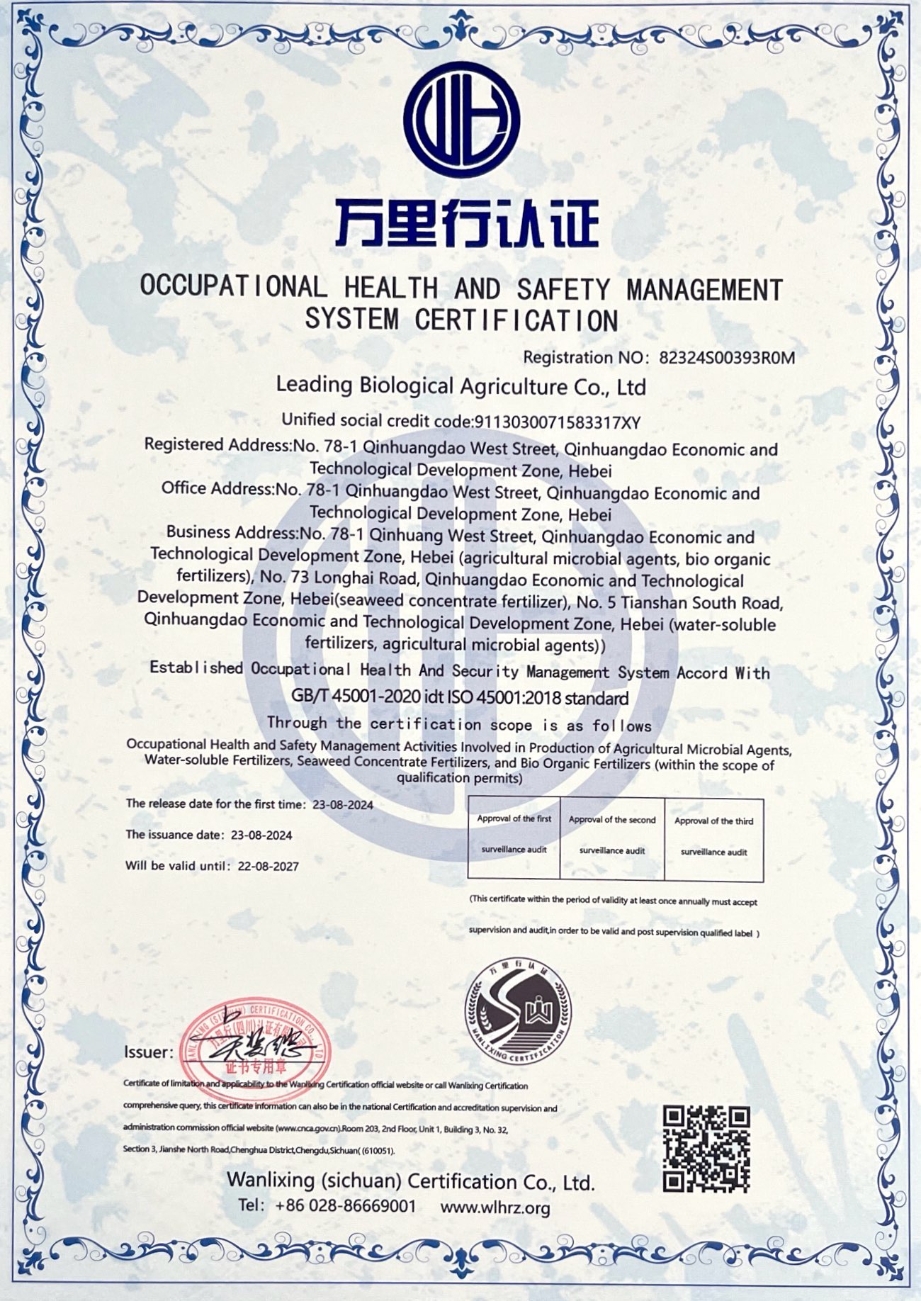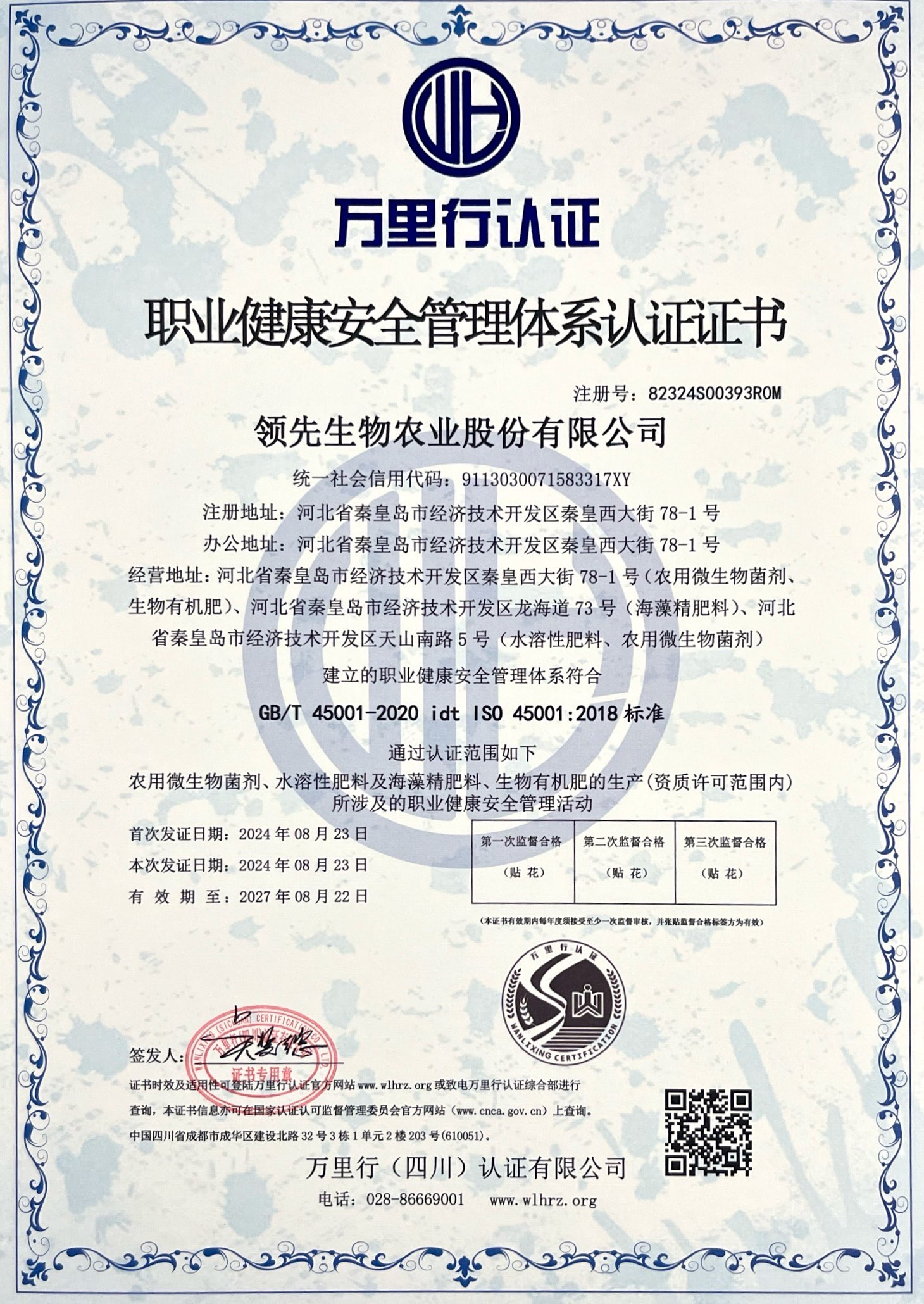 職業(yè)健康安全管理體系認證證書